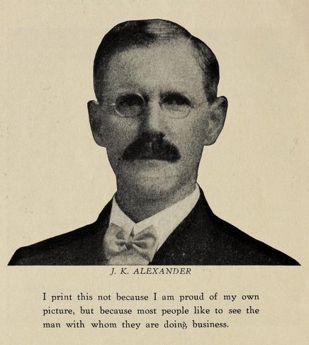 “I print this not because I am proud of my own picture, but because most people like to see the man with whom they are doing business.”- J. K. Alexander